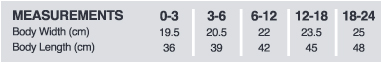| Size | 0000 (New Born) | 000 (0-3m) | 00 (3-6m) | 0 (6-12m) | 1 (12-18m) |