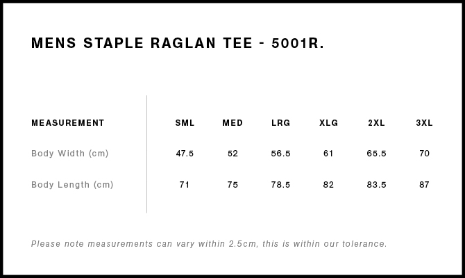 Neck ribbing, side seamed, raglan sleeves, double needle hems, preshrunk to minimise shrinkage